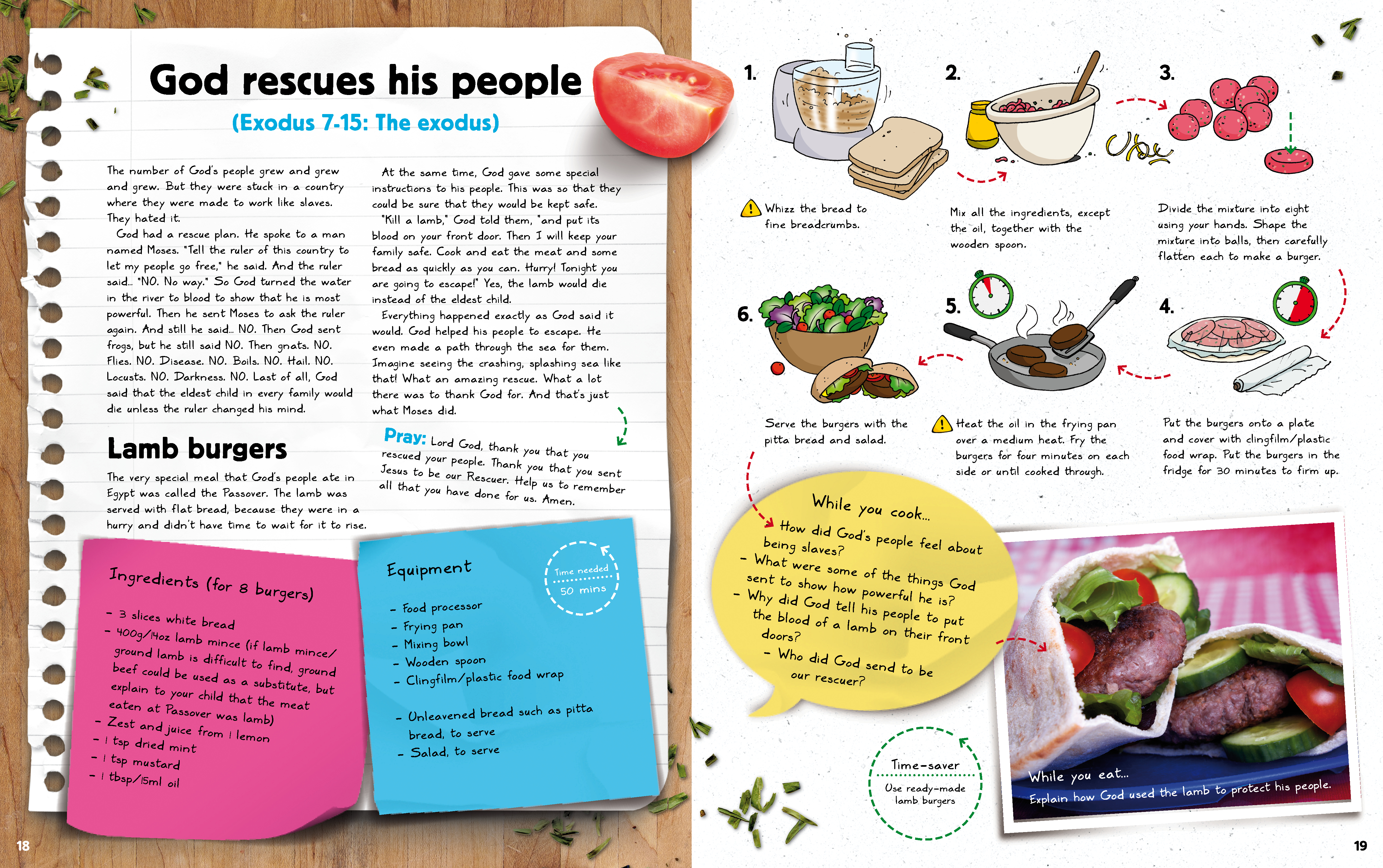Planning a barbeque this summer? These lamb burgers are a tasty twist on the usual barbeque foods—make them with your children to remind them how God rescued his people from slavery in Egypt (Exodus 7 -15). Tell the Bible story; do the cooking activity; and talk about what you’ve learned.